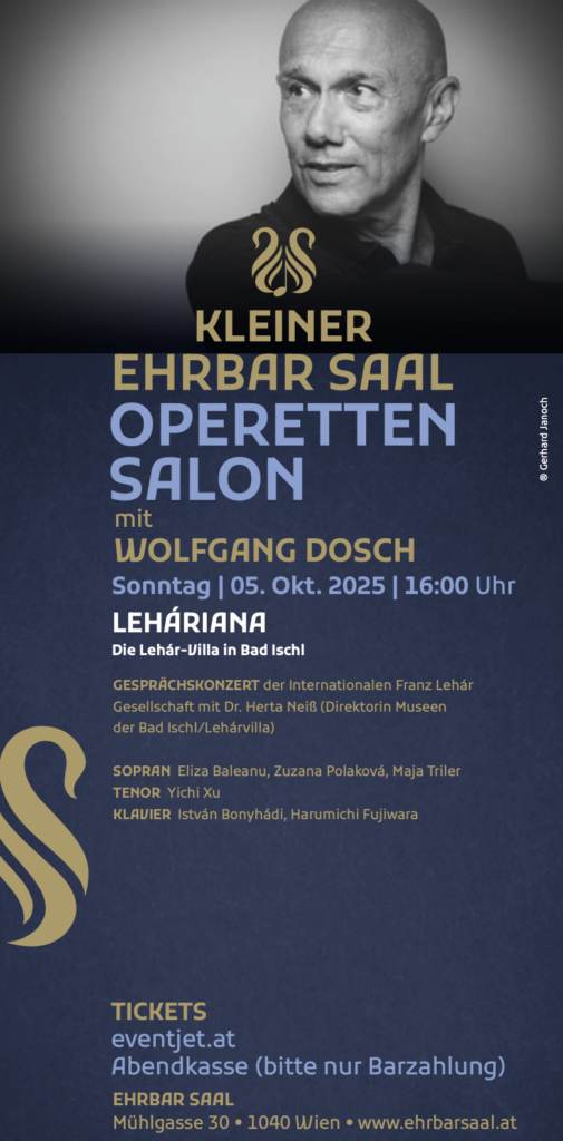 Freue mich auf mein Gesprächskonzert LEHÁRIANA über die wunderbar neu sanierte Lehár Villa Bad Ischl mit der Direktorin der Museen Bad Ischl: Dr. Herta Neiß. Gemeinsam mit Musik von Franz Lehár, gesungen von den jungen Sängerinnen Eliza Baleanu, Zuzana Polakova, Maja Triler und István Bonyhadi und Harumichi Fujiwara am Klavier. Operetten-Salon mit der Internationalen Franz Lehár Gesellschaft – herzliche Einladung! Im Ehrbar-Saal! Am 5. Oktober 2025!