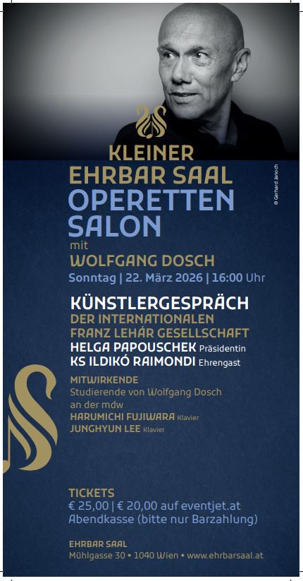 Am 22. März 2026 gibt es Grund zur Freude in dieser scheinbar unsicherer werdenden Welt: Operetten Salon, diesmal mit Ehrengast Ildikó Raimondi und der Präsidentin der Int. Franz Lehár Gesellschaft, Helga Papouschek im Künstlergespräch. Es wird ein schöner Nachmittag im Ehrbar-Saal und ich freu mich, wenn ihr, ihr, ihr und auch ihr dabei seid!
